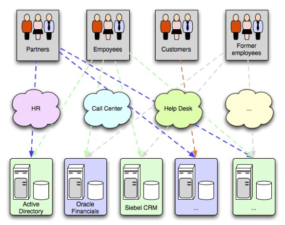 Consideriamo la situazione descritta nella figura seguente: un tipico scenario aziendale in cui differenti gruppi di utenti (partner, impiegati, clienti..) hanno diverse strade per accedere ai vari servizi e applicazioni messe a disposizione dall’azienda. Ognuno di questi “sistemi” ha un proprio store e, di conseguenza, ognuno degli utenti avrà una propria credenziale di accesso e un proprio profilo su quel sistema. Il processo autorizzativo, completamente indipendente e delegato ad ogni singola applicazione, espone l’organizzazione al rischio concreto, come nel caso in questione, di avere accessi non autorizzati (ex dipendenti) ad informazioni riservate.